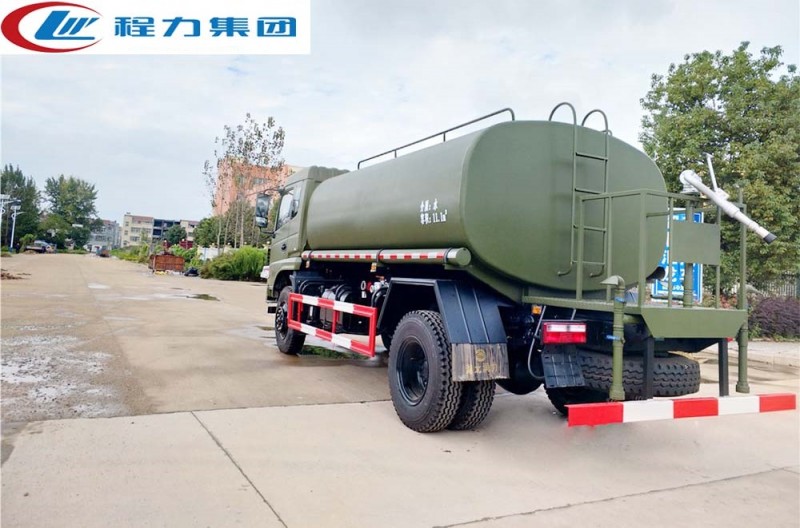 該車可做東風(fēng)四驅(qū)沙漠運(yùn)水車使用,罐裝有效容積13立方,采用優(yōu)質(zhì)碳鋼焊接而成,自動(dòng)流水線罐體生產(chǎn)工藝分為:下料、拼板自動(dòng)焊,封頭旋壓成型,罐體一次滾壓成型等國內(nèi)先進(jìn)生產(chǎn)工藝。帶前沖(噴)、后灑、后工作平臺(tái),平臺(tái)上有高壓水炮(炮可360全方位旋轉(zhuǎn),可連續(xù)調(diào)節(jié)為柱狀、開花狀、雨?duì)睢腱F狀水流),配備大功率專用灑水泵,帶2根透明鋼絲抽水管,泵可自吸自排,帶過濾網(wǎng),可從野外河流里抽水;帶消防接口,可從城市消防栓處取水;帶自流閥,可自然排水或者采用水泵進(jìn)行加速排水。 東風(fēng)四驅(qū)消防灑水車在設(shè)計(jì)上內(nèi)置消防泵夾心取力器,泵倉位于罐體前部,隱藏設(shè)計(jì),有倉門,有效容積為8.0立方,配專用大功率消防灑水車炮,最大射程30m
