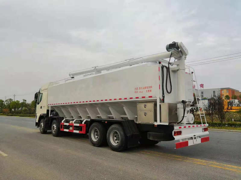 柳汽前四后八散裝飼料運輸車,公告型號;HTX5310ZSLL7,HYS5310ZSLL6。底盤型號:LZ1310H7FCT,5.5T前橋,2*440后橋/4.444/加寬制動器/油潤滑,軸距2050+4400+1350,H73D駕駛室,YCK09400-60,12JSD180TA(鋁),Ф430拉式離合,板簧3/3/10,282(8)車架,600L鋁合金油箱,12R22.5,全氣囊駕駛室懸置、電動液壓翻轉、夾層玻璃、電動玻璃升降器、氣囊減震司機座椅、金屬漆、電動電加熱后視鏡、LCD液晶儀表、MP3+收音機、自動空調、真皮多功能方向盤、定速巡航系統、多態開關、電控硅油風扇、WABCO閥(空氣處理單元、駐車手控閥、制動總泵)、鋁合金貯氣筒、ABS、中控鎖、自動調整臂、右轉提示音響、165AH電瓶、輕量化鋼圈。(3480)