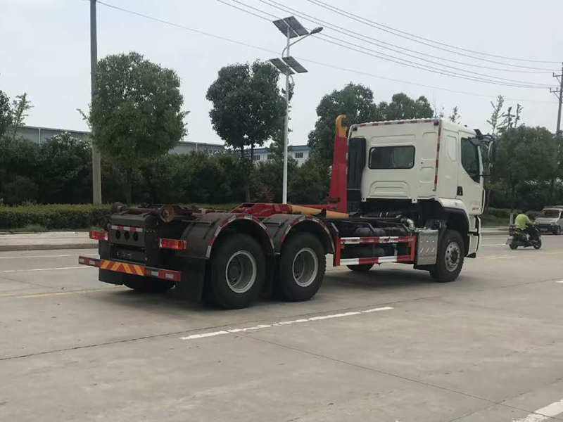 上裝配置:】勾起能力20T,設(shè)備自重2400Kg,鉤臂伸縮量1000mm,鉤箱時(shí)間45S,鉤心高度1570mm,鉤心到后滾輪距離5275mm,拉臂鉤結(jié)構(gòu)件Q460高強(qiáng)鋼Q345低合金高強(qiáng)鋼,該車是由汽車底盤、拉臂主油缸、附車架、翻轉(zhuǎn)架、支撐腿(選裝)、鎖緊架、鎖緊油缸及多路換向閥等組成。